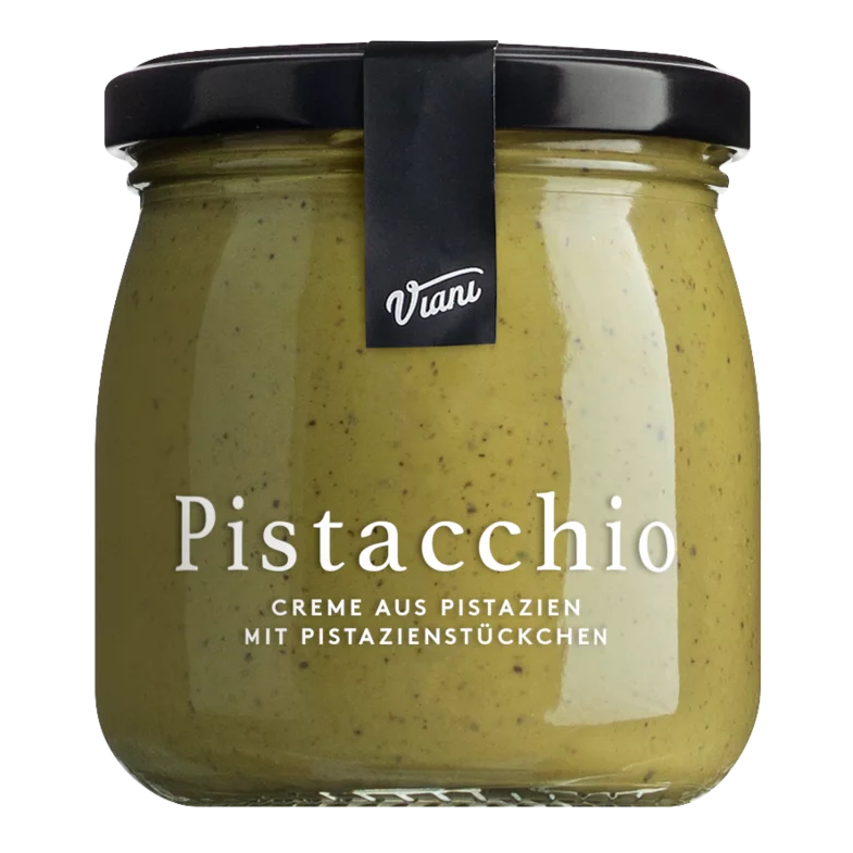 Die stückige Creme enthält 35% Pistaziencreme und 10% Pistazienkerne als Stückchen. Die Konsistenz ist also angenehm körnig und der Geschmack intensiv mit einer feinen Süße. Sie lässt sich gut aufs Croissant streichen und auf Toast. Für Frühstück und Nachmittagstee bestens geeignet.